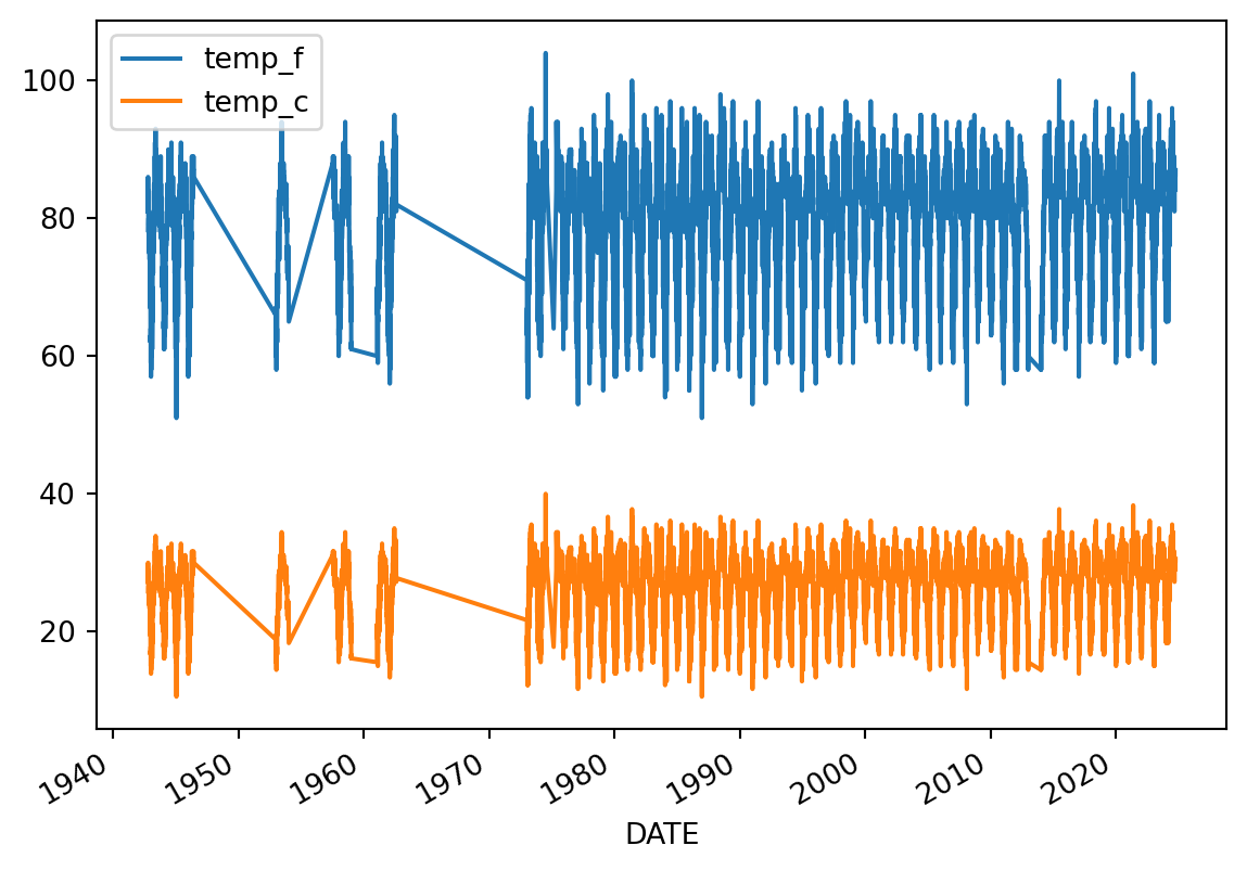 DT_OFFSETwith a Datetime Offset Code. Check out the table in the pandas datetime documentation to find the one you want (we recommend the start of the year).agg_method_here with a method that will calculate the average annual value. Check out the pandas resampling documentation for a list of common built-in options.| temp_f | temp_c | |