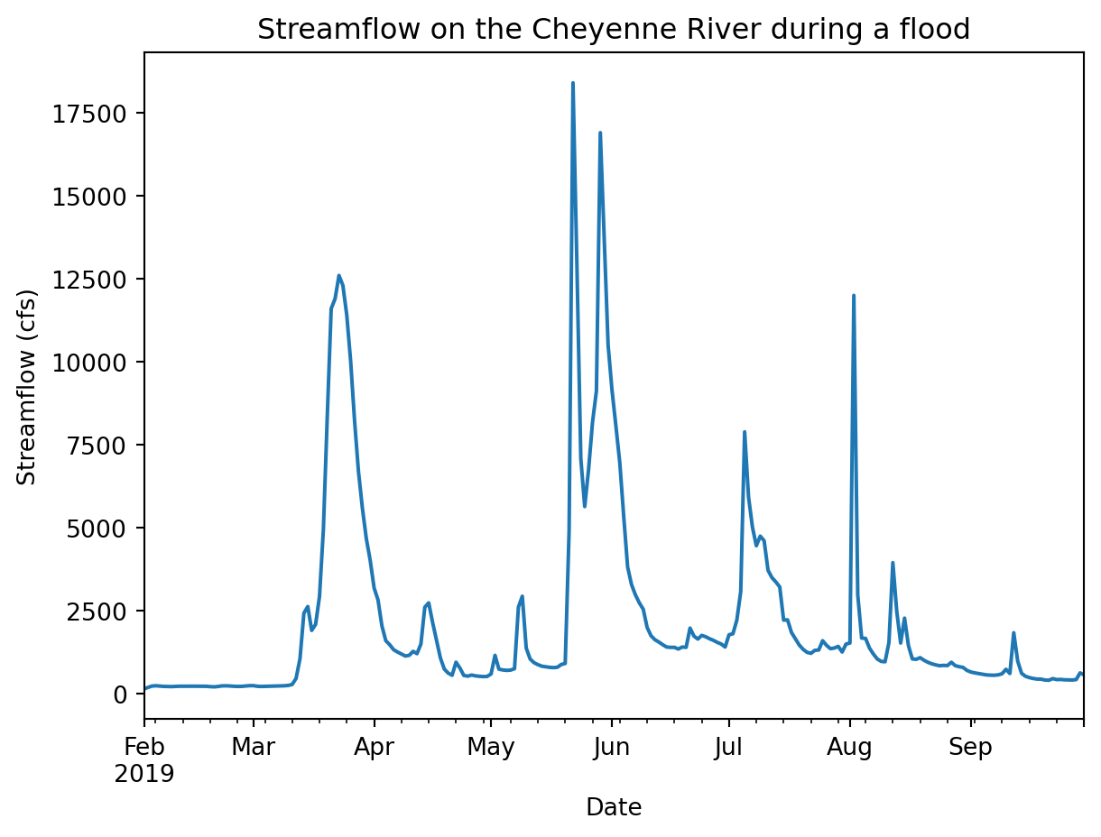 In this notebook, you will write Python code to download and work with a time series of streamflow data during the flooding on the Cheyenne River.