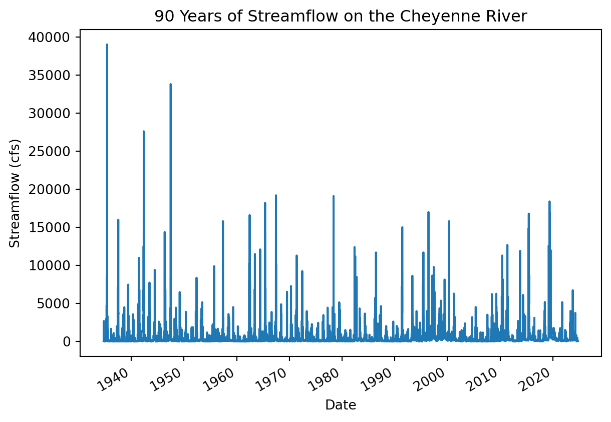 It turns out that construction on the Oahe dam on the Cheyenne River was started in 1948. We therefor don’t want to include any streamflow measurements before that date, because the Cheyenne River now as a much different flood response due to the dam. Dams tend to reduce peak streamflow, depending on how they are managed, but can cause other problems in the process.