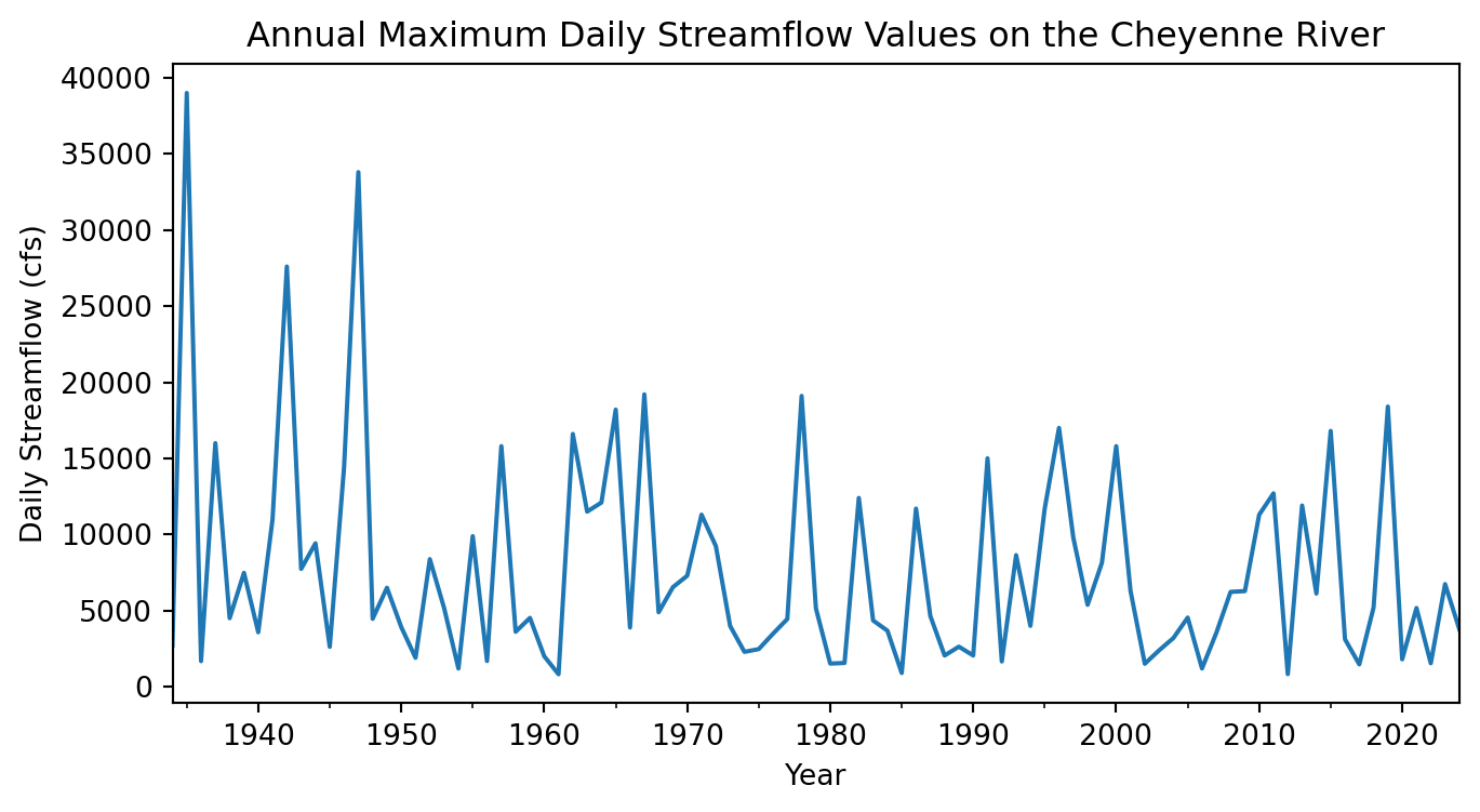 First things first – this plot looks a little fuzzy because it is trying to fit too many data points in a small area. There aren’t enough pixels in this plot to represent all the data points! One way to improve this is by resampling the data to annual maxima. That way we still get the same peak streamflows, but the computer will be able to plot all the values without overlapping.
